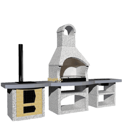 Вы можете разместить модульные печи барбекю на открытом воздухе, так как фасад покрыт декоративной штукатуркой, которая защитит барбекю от внешнего воздействия окружающей среды. Помимо этого можно осуществить установку элементов для приготовления пищи в беседке или на террасе с навесом с помощью переходника на сэндвич трубу. Такой переходник позволит безопасно вывести дымоход сквозь кровлю. За счет двойной трубы с утеплением(сэндвич) вы можете осуществить отвод дымовых газов  и увеличить тягу воздуха, что поспособствует большей теплоотдаче от углей или дров. Комплекс из бетона может состоять из мангала, печи под казан, тандыра, столика с мойкой и углового столика.