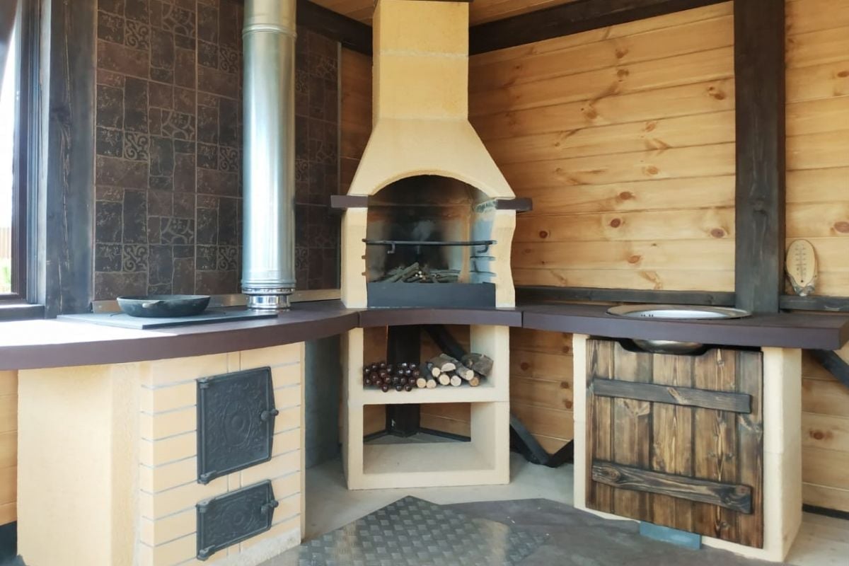 Мангал "BBQ64" с печью под казан разделочным столом и мойкой солома кирпич